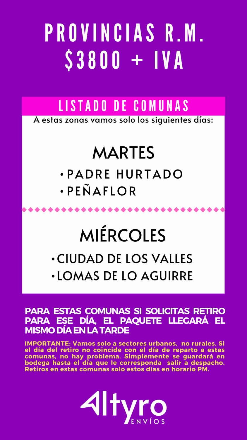Límites Comunas Estándar - Pudahuel: Diariamente llegamos solo hasta el límite con vespucio, todo lo que quede fuera de ese límite, es decir, sectores como Ciudad de los Valles y Lomas de lo Aguirre (sectores pertenecientes a Pudahuel, pero muy alejados del radio de la ciudad) se harán exclusivamente los días miércoles y tendrán valor de provincia ($3.990). Es responsabilidad del socio altyro conocer estos límites e informarse sobre su ubicación en el mapa, en caso de tener dudas puede comunicarse con la línea de atención al cliente y le asistiremos. Si el paquete llegó a bodega cualquier otro día que no sea miércoles, será guardado cuidadosamente en una sección especial y será despachado el día correspondiente. NO VAMOS A NOVICIADO. - Lo Barnechea: Hacia el poniente, llegamos hasta el colegio Craighouse y al oriente hasta la Plaza San Enrique. NO VAMOS A CAMINO A FARELLONES NI AL SECTOR DEL ARRAYÁN. Es responsabilidad del socio altyro conocer estos límites e informarse sobre su ubicación en el mapa, en caso de tener dudas puede comunicarse con la línea de atención al cliente y le asistiremos. - San Bernardo: Llegamos diariamente hasta la calle "Camino Nos Los Morros". Toda dirección que corresponda a esta comuna pero que esté ubicada hacia el sur de la calle mencionada, se hará solo los días lunes. Es responsabilidad del socio altyro conocer estos límites e informarse sobre su ubicación en el mapa, en caso de tener dudas puede comunicarse con la línea de atención al cliente y le asistiremos. Límites Provincias Vamos solamente a los sectores urbanos y céntricos de estas comunas, no a sectores rurales ni de difícil acceso.